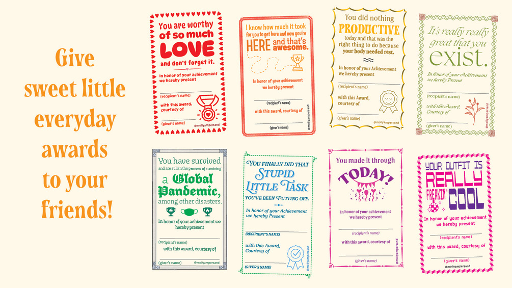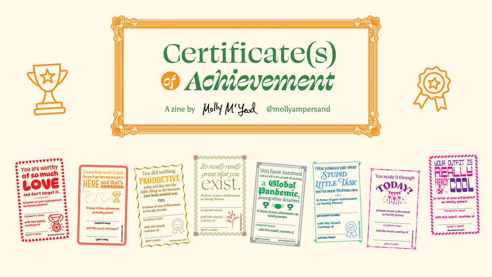 Enclosed in this digital zine are eight (8) certificates that celebrate everyday life achievements. You can print them out and give them to people who need them. You are also 1,000% allowed to give them to YOURSELF.